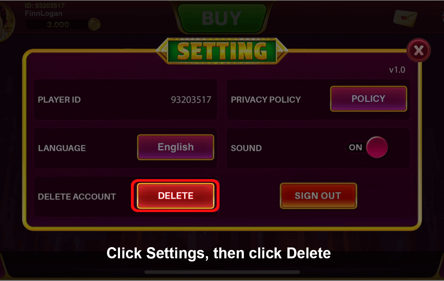 1. Step 1: Click "Setting" -> "Delete Account" button at middle of popup